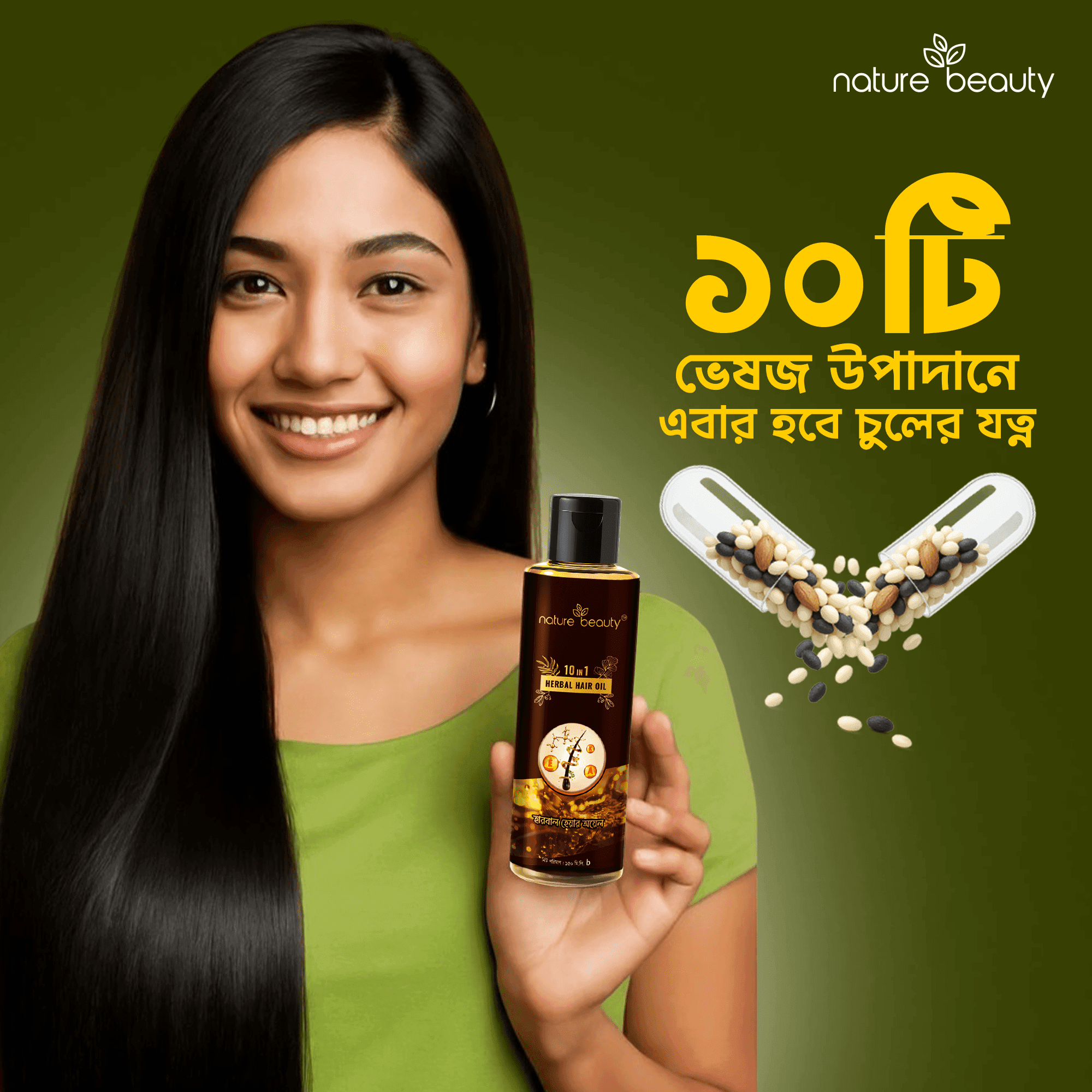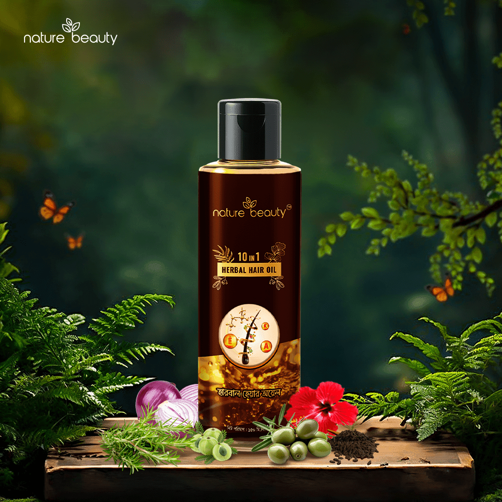 Nature Beauty 10 in 1 Herbal Oil contains a perfect blend of 10 natural herbs that strengthen hair roots for voluminous bounce. Redefine your beautiful hair, naturally!